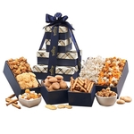 Popcorn makes a marvelous pairing with snickerdoodle crisps, pretzel sticks, and parmesan crisps for a sweet and savory assortment sure to please every recipient. Whether for an office or family to share or for a single person who enjoys variety, this sleek tower provides an experience they're guaranteed to appreciate. For the final touch, we foil-stamp your logo on the ribbon tying all this goodness together. Serves 8-10. Tower measures 7.375" x 7.375" x 9". Minimum order 8.